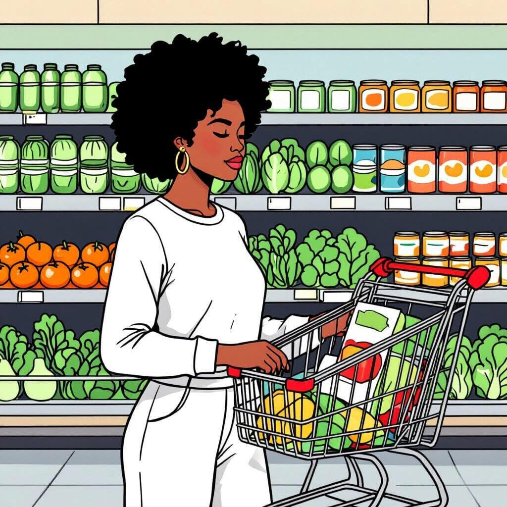 This image shows a black woman calmly grocery shopping in a supermarket. It is a minimalist coloring page style image with bold lines and flat colors, depicting a modern scene.