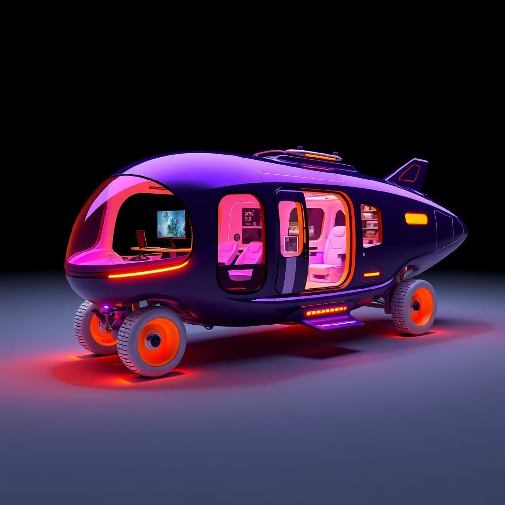This image showcases a highly detailed, futuristic flying ship house in a 3D anime art style, featuring a sleek dark purple and orange design, with a spacious 12-passenger cabin and a mesmerizing purple and orange mirage effect on the car, set against a black background with vibrant orange accents.