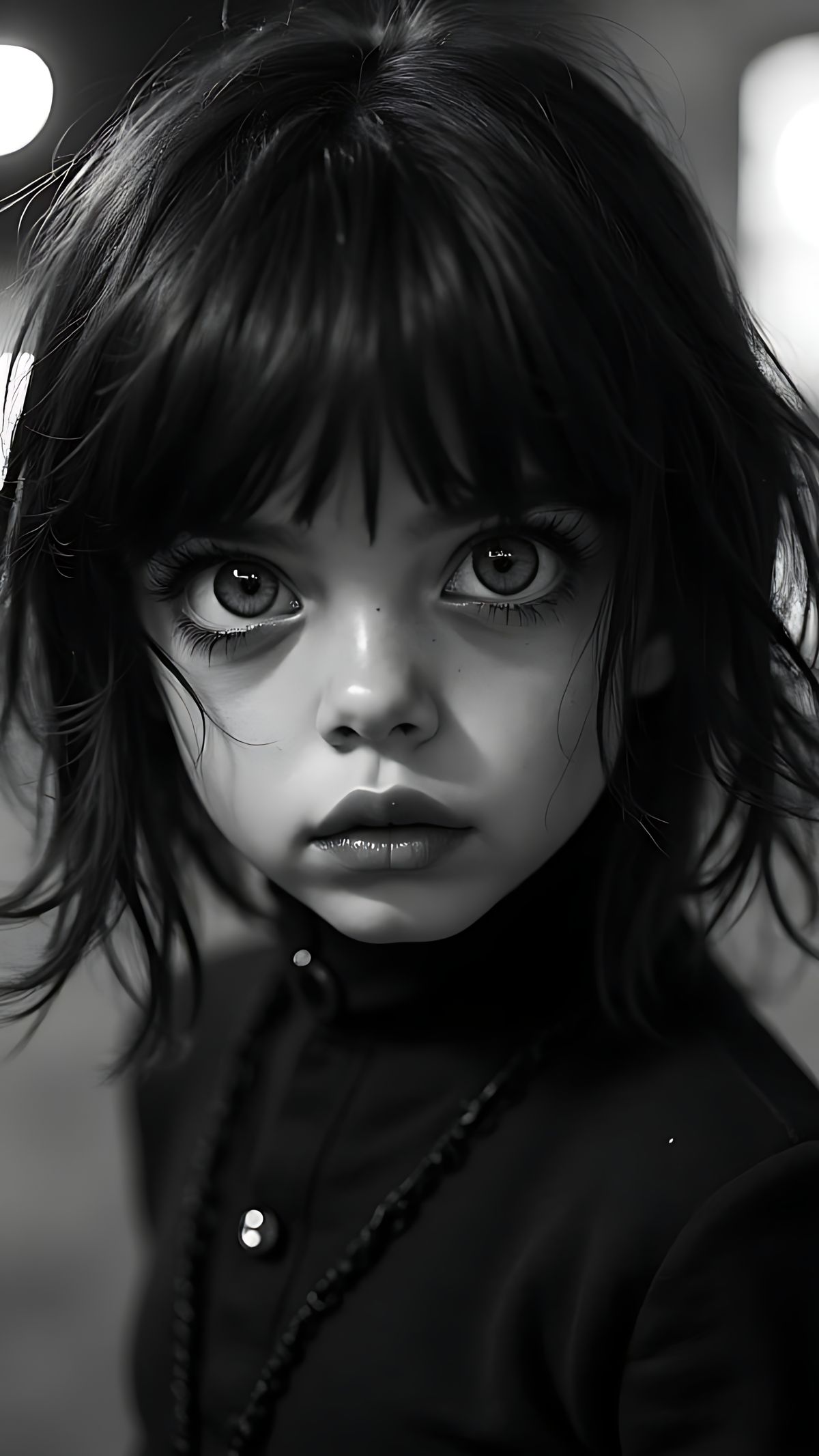 ‘A pretty, Chibified, New Wave, Gothic street urchin with abnormally wide expressive eyes’, extremely high detail, photorealistic, digital art, cinematic, studio quality Agfapan professional Black & White film, shallow depth of field, dark background night photo, post-processing, post-editing, finished ...