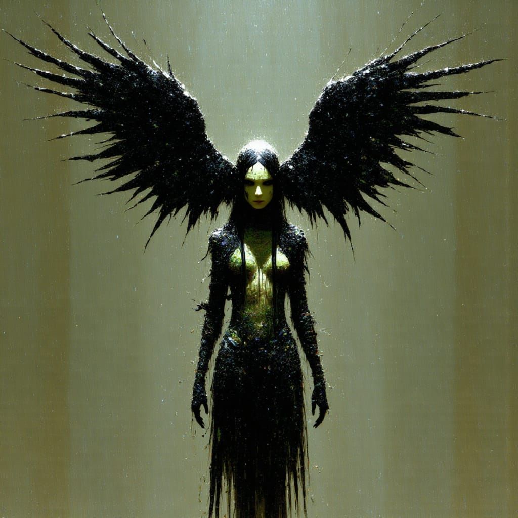 This striking image depicts a female druid with raven-inspired features in a dreamlike setting. It showcases dynamic lighting, intricate details, and a mystical atmosphere with volumetric effects, rendered in a concept art style.