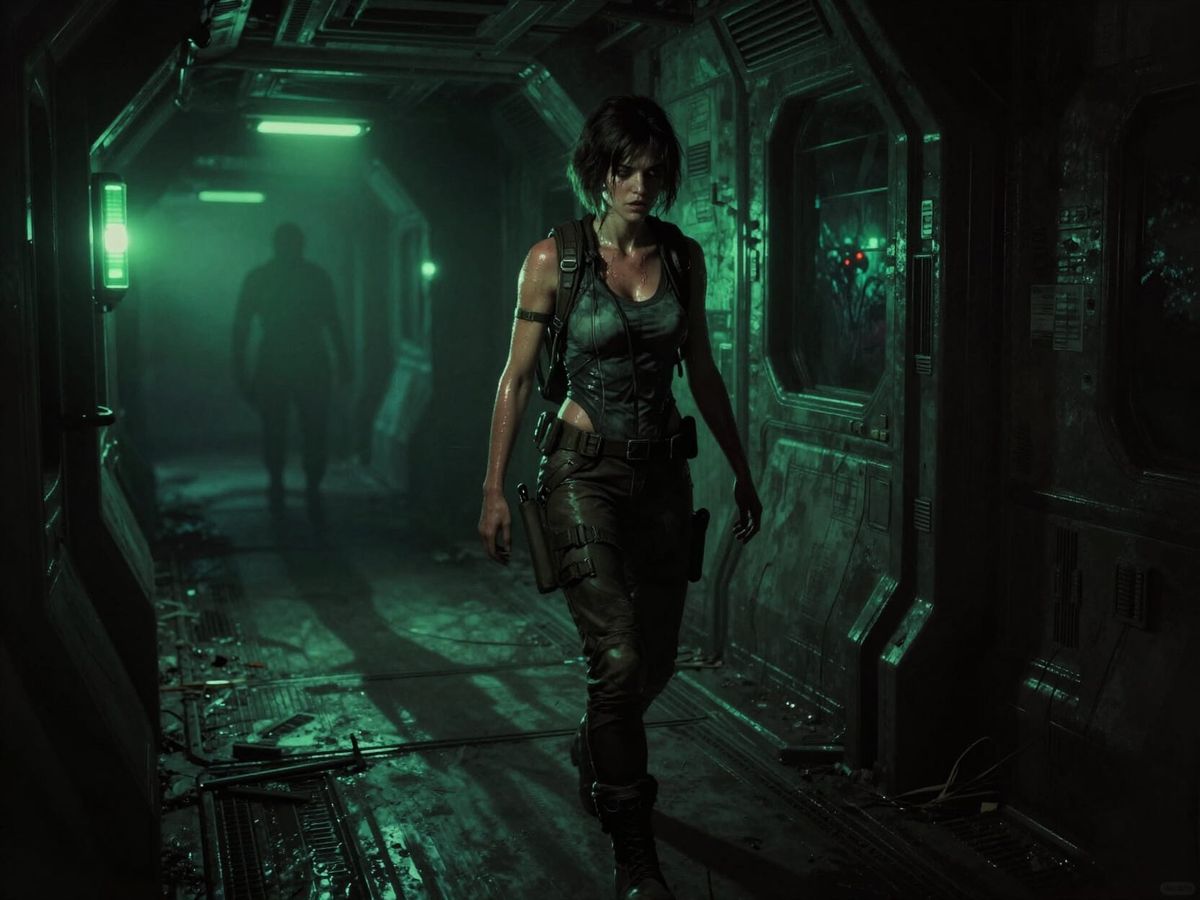 This dark fantasy concept art depicts a tense scene in a dimly lit spaceship corridor, featuring a sweaty explorer cautiously moving through shadows with a monstrous figure lurking beyond.