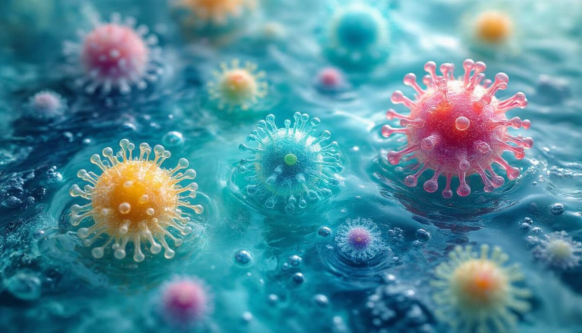 This image showcases a stunning microscopic view of vibrant viruses and amoebas swirling in turquoise water, enhanced by lifelike lighting and intricate detail. Photographed with a macro lens for exceptional clarity.