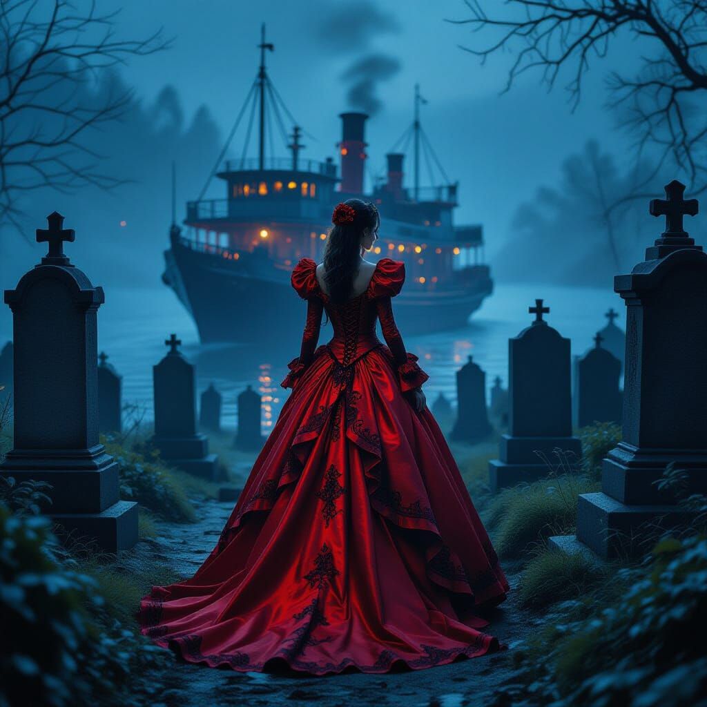 He’s stunning double exposure image featuring a beautiful email Gothic ferry, a breathtaking graveyard, she wears a metallic orange and red Gothic steampunk dress, her ethereal very form we seem mostly with the graveyard, silhouette, creating an enchanting blend of the supernatural in the maritime, in ...