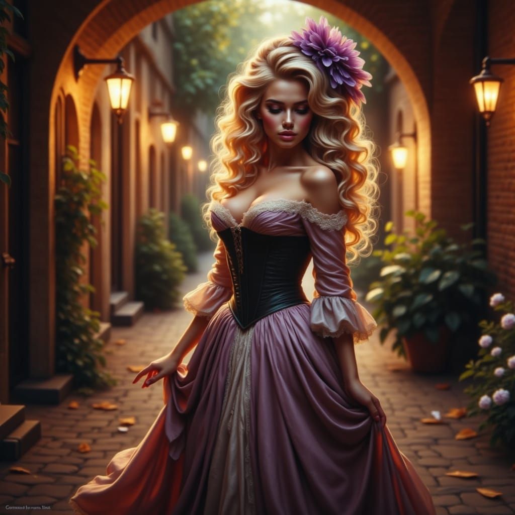 This enchanting digital art piece features a beautiful woman posing in a dimly lit alleyway, surrounded by warm brick arches and softly glowing lanterns. She wears a stunning Victorian-inspired outfit with intricate lace details and a lavish purple hat. The image is rendered in exquisite airbrush detail,...