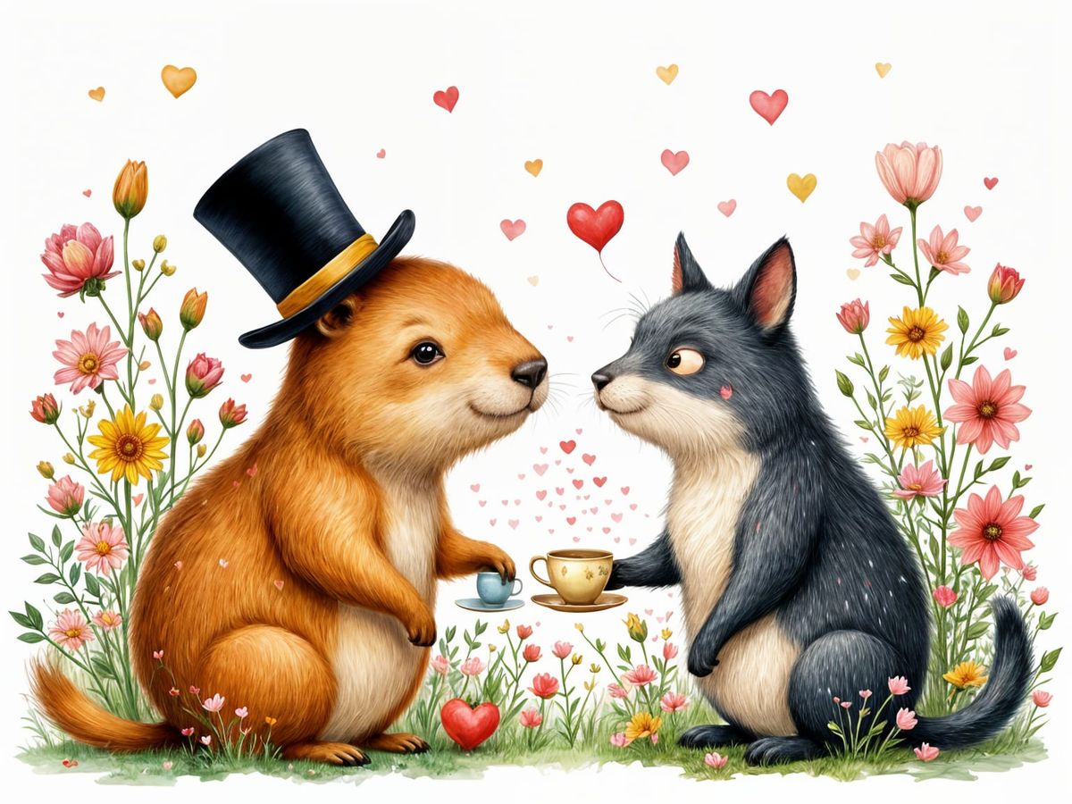 This image shows a capybara and a cat sharing tea in a flower-filled garden, rendered in a cute gothic illustration style with vibrant pastel colors.
