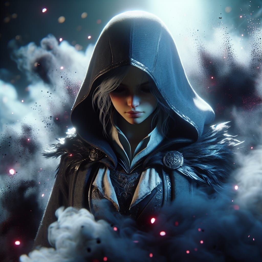 Craft a cinematic scene from a fantasy video game using realistic elements and dynamic lighting. The subject of this scene is a young female assassin, her cloak flowing around her. Her attire and form are highlighted by an ethereal blue glow, black ashes resembling a cloud of thunderbolts surround her. ...
