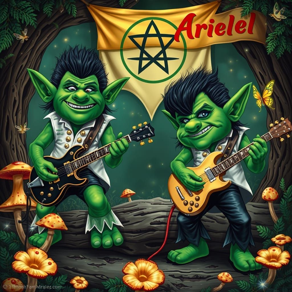 A digital artwork of green, Elvis-like trolls with pompadours playing guitars on a log stage. The scene includes mushrooms, fireflies, and fairies, with a banner displaying a pentagram logo, rendered with psychedelic and heavy metal elements.
