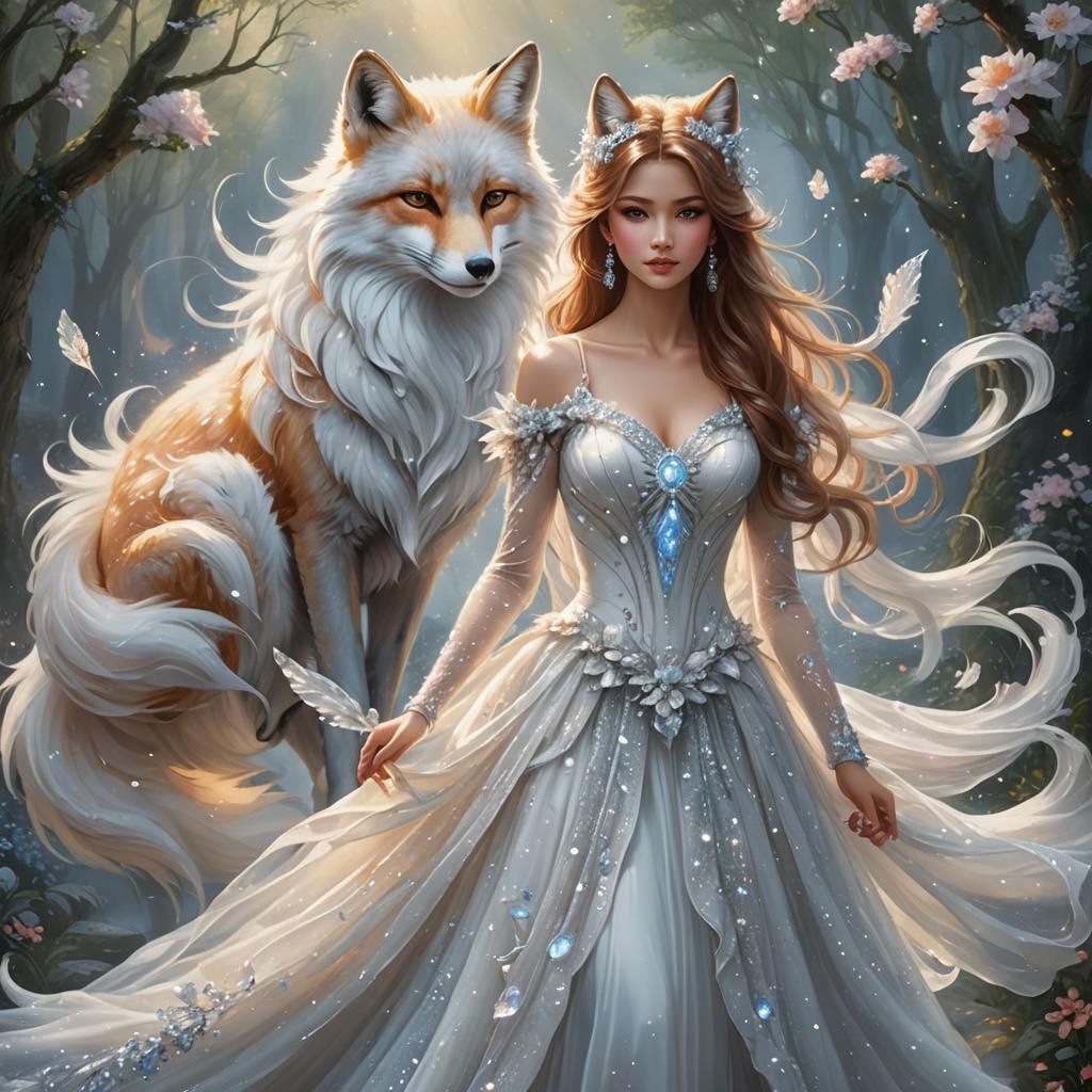 This image shows a beautiful nine-tailed fox woman in a flowing white dress. The tails are luminous and ethereal, rendered in a hyperdetailed, fantasy style.