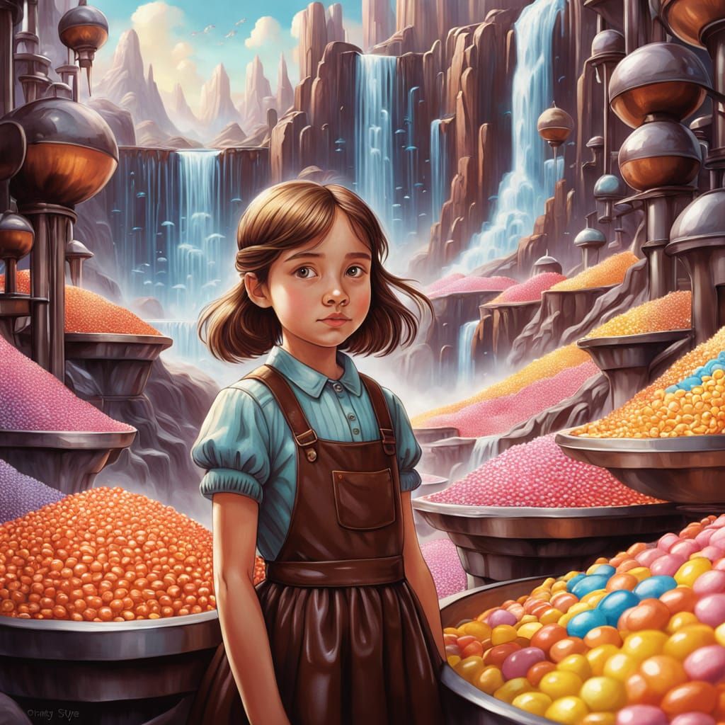 This image shows a beautiful little girl surrounded by a whimsical chocolate factory, complete with waterfalls of melted chocolate and colorful candies. The scene is rendered in a glossy colored pencil style with intricate details and a warm, golden lighting.