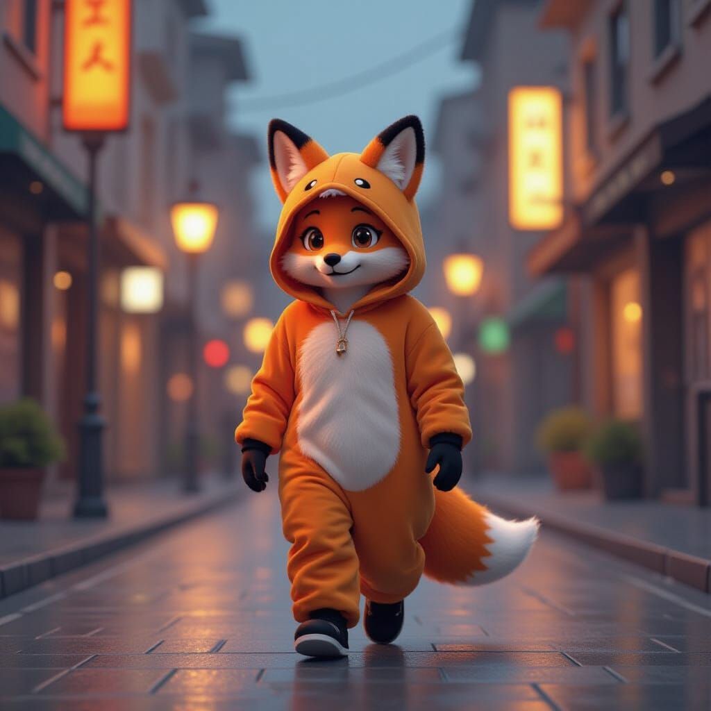 A person in a fox costume strolls through a city street, captured with vibrant colors and lively textures, evoking expressive illustration styles.