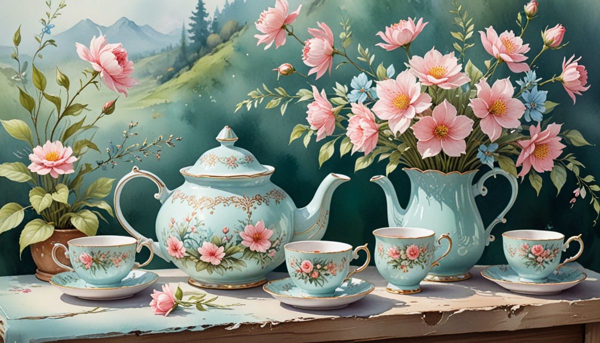 This image depicts a charming watercolor scene of a countryside setting adorned with flowers, featuring a tea set with teapots and cups. Rendered with hand-painted details and a vibrant, light aquamarine and bronze palette.