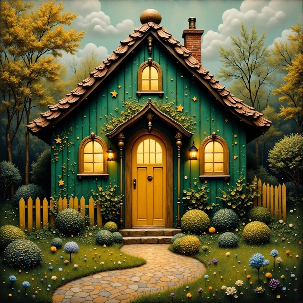 A charming image of a quaint green cottage featuring a golden door, nestled in a vibrant garden. The artwork evokes a whimsical storybook aesthetic with rich, atmospheric lighting.
