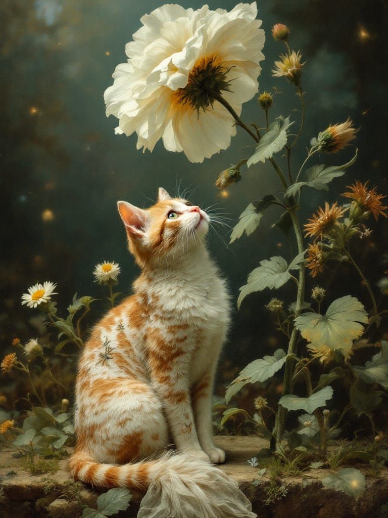 This image showcases an adorable cat under a tall flower, rendered in academic realism with intricate botanical body art. Features luminous skin tones and dreamlike softness with flickering light effects.