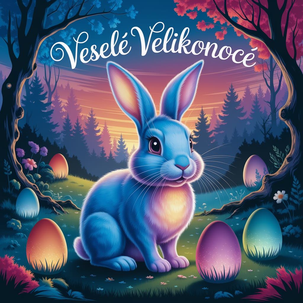 This enchanting image depicts a fantasy Easter bunny surrounded by vibrant, glowing eggs in a mystical forest at sunset. The scene is bathed in warm, magical light, with the bunny's fur and eyes shining with a soft, golden glow.