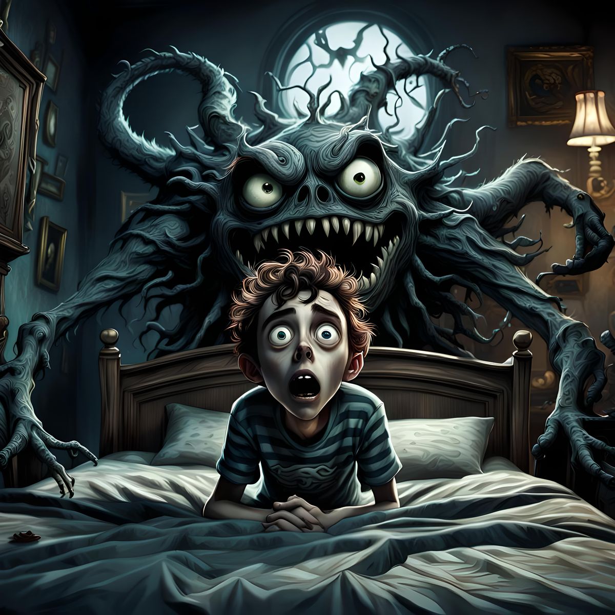 This image shows a frightened boy hiding on his bed from a monster lurking beneath. The scene is rendered in a Tim Burton-esque style, with intricate details and deep colors.