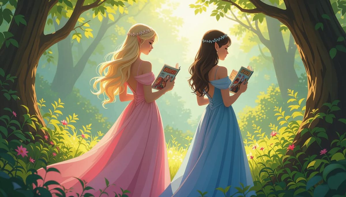 This image shows two elven sisters, one blonde in pink and one brunette in blue, standing back to back reading comic books in a vibrant, detailed forest setting. The artwork features deep colors and intricate details, evoking a sense of fantasy and wonder.