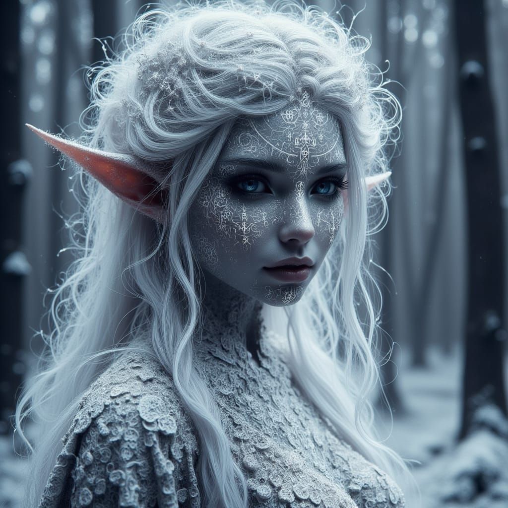 A striking picture of a snow-white elf in a frosty forest. The elf has blue eyes and intricate runes on her face, and wears an embroidered white cloak in a fantastical style.