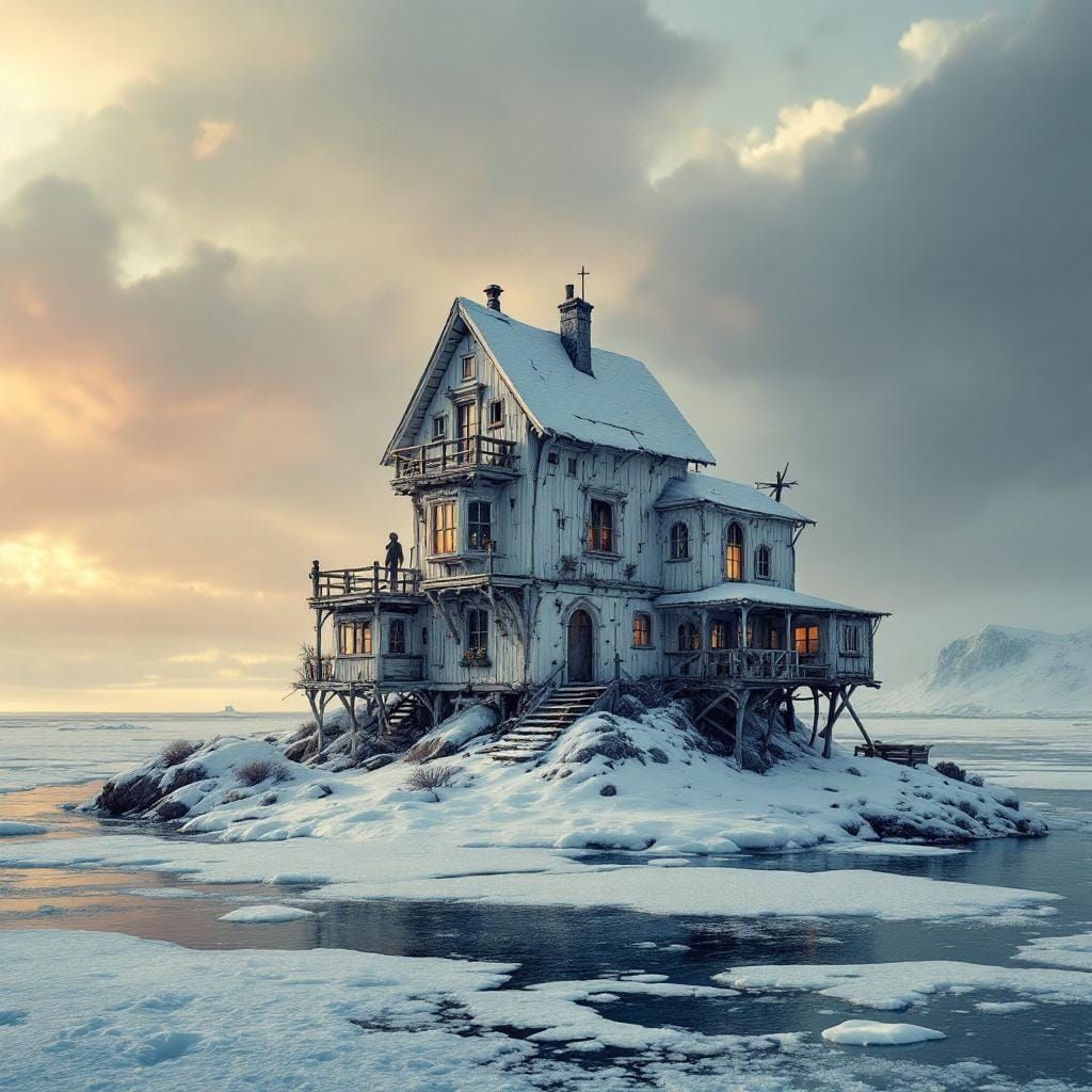 This image shows a dilapidated white wooden house perched on a small ice island in a frozen ocean. Golden light illuminates the scene, while snowstorm clouds gather, creating a cinematographic composition in a Tim Burton-esque style.