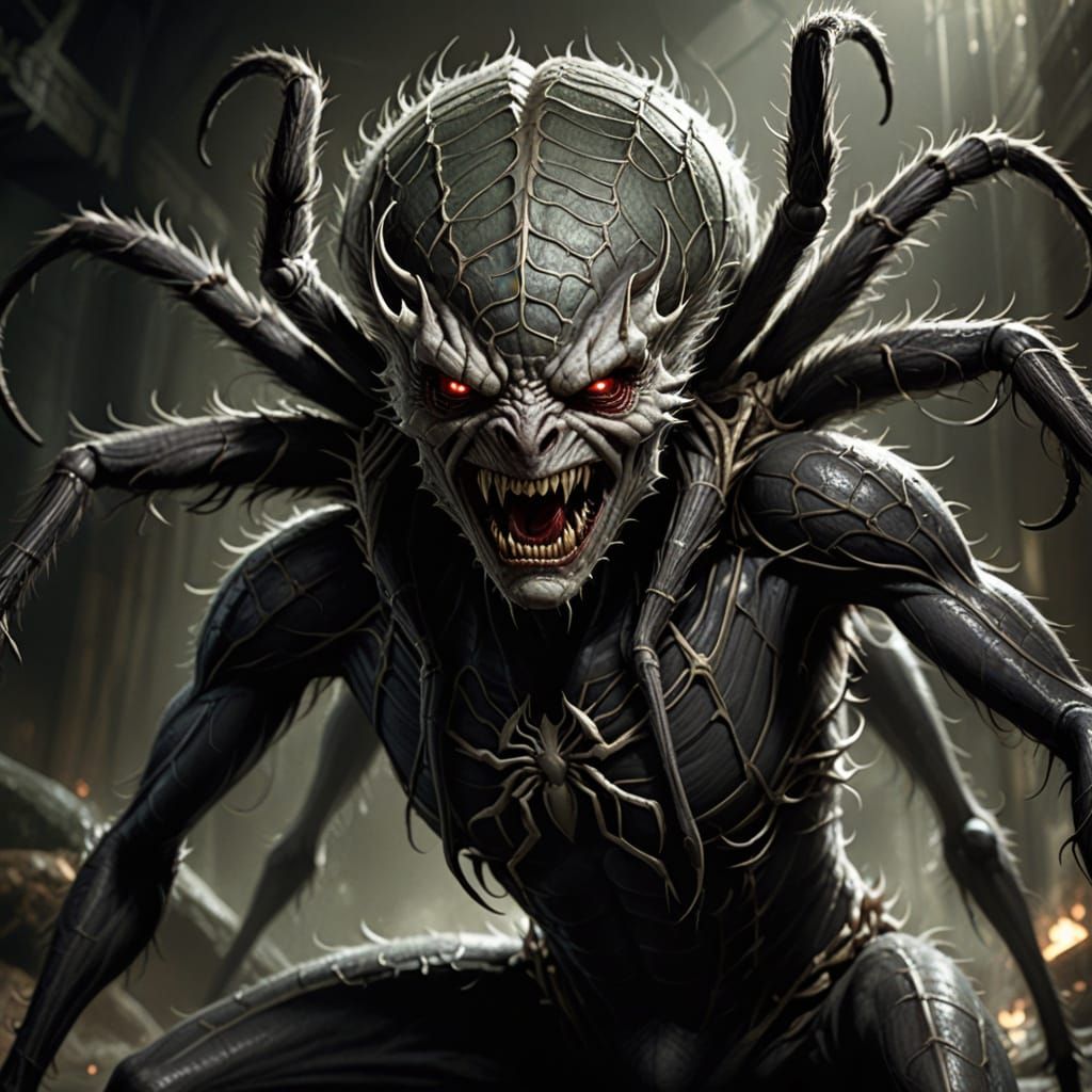 This image depicts a terrifying creature with the upper body of a man and the lower body of a spider, exuding a sense of dark magic and foreboding menace.