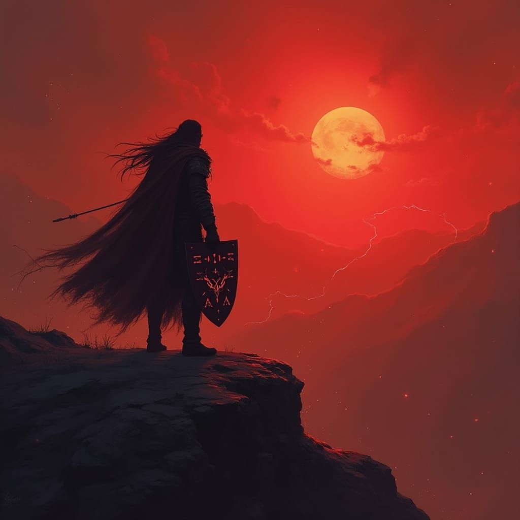 A dramatic digital painting of a Nordthra warrior silhouetted on a peak at sunset. The scene features a shattered shield with runes, crackling energy, somber tones, and dramatic lighting.