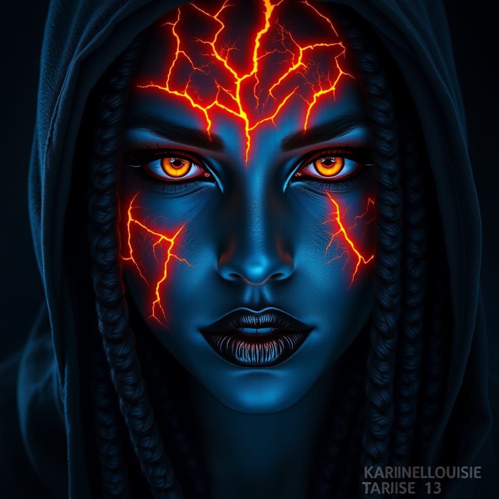 This image shows a mystical woman with dark blue skin, glowing orange cracks, and piercing yellow eyes, surrounded by a sense of foreboding and otherworldly energy, in a highly detailed digital art style reminiscent of cyberpunk and sci-fi