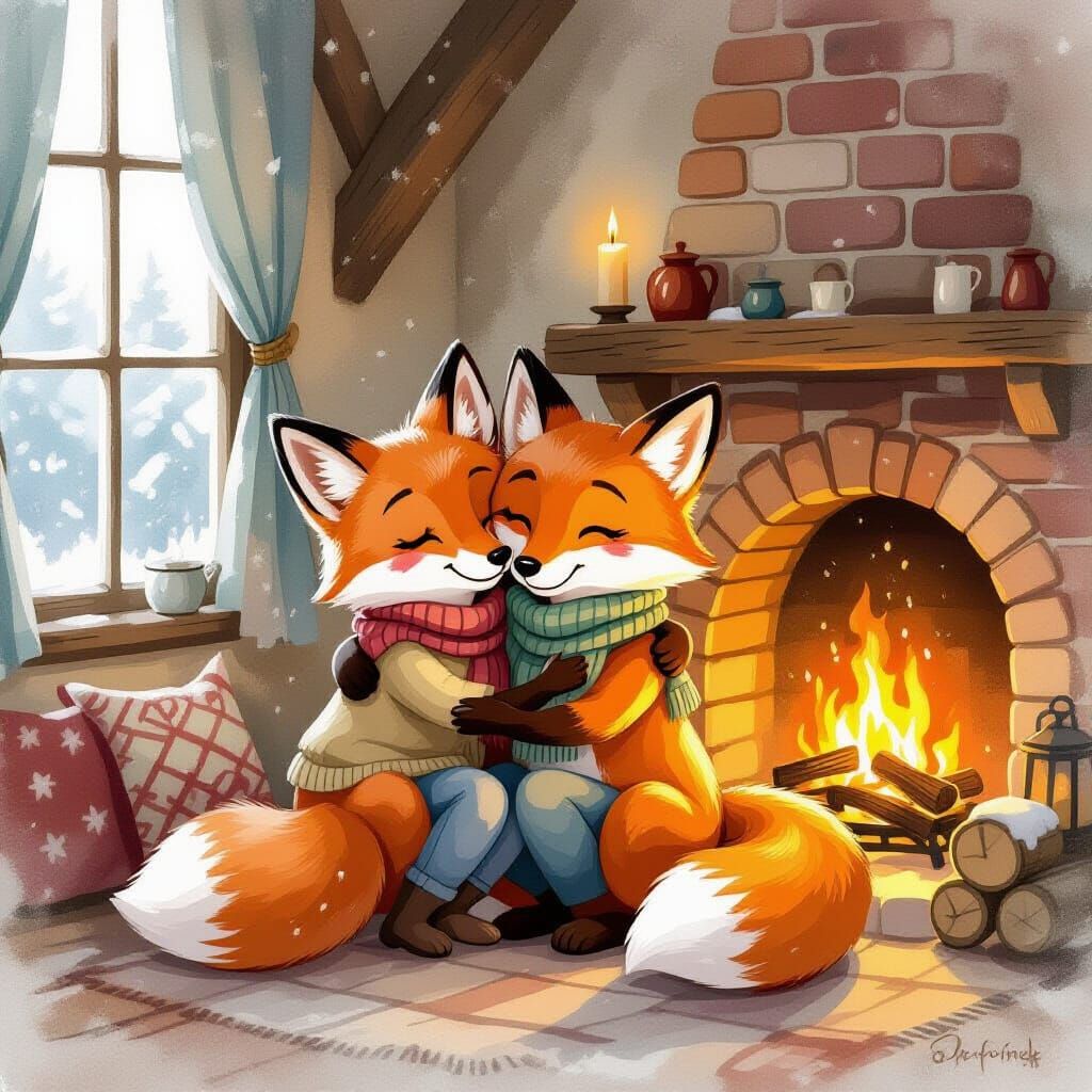 This image depicts an anthropomorphic fox couple embracing by a fireplace in a vintage cottage. Rendered in a storybook illustration style with watercolor textures, it evokes warmth and comfort.
