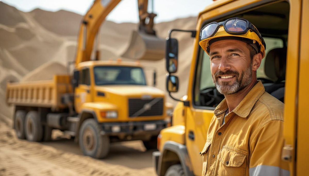 This image shows a yellow flatbed truck in a sand quarry as it is being loaded with sand by an excavator. The image is a highly detailed portrait with vibrant colors and sharp focus.