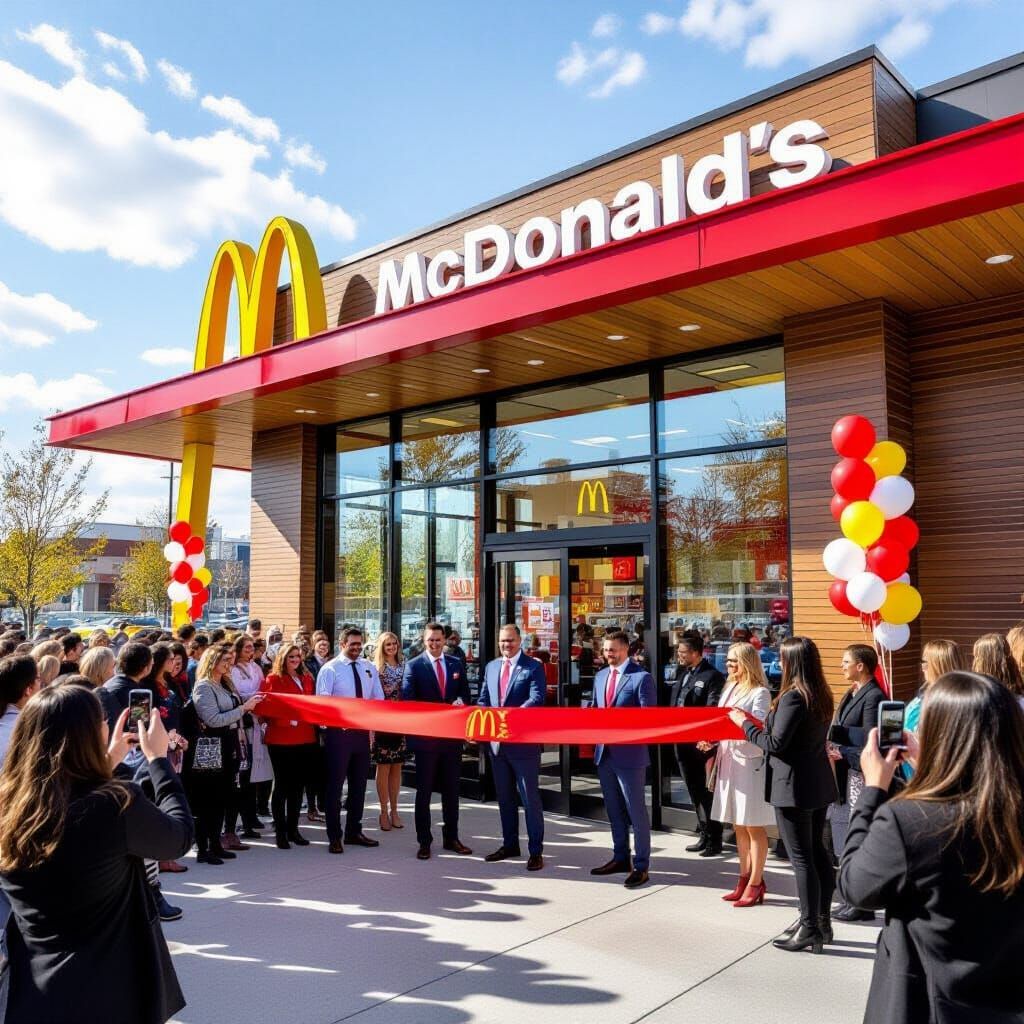 This image depicts a grand opening of a McDonald's restaurant. A large crowd has gathered outside the modern building with clean architecture. The scene is photorealistic, capturing a festive atmosphere.