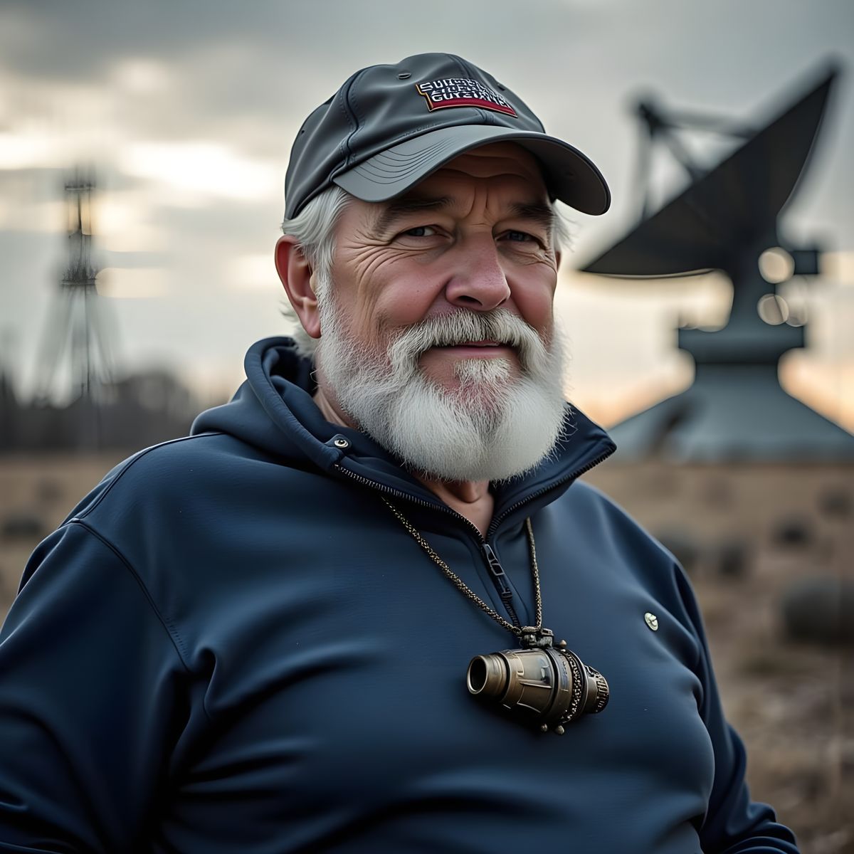 A mature man with a thick white beard and serious expression is depicted in a futuristic scene, possibly on a planet or space station, with a radio telescope in the background and a detailed vessel pendant on his chest.