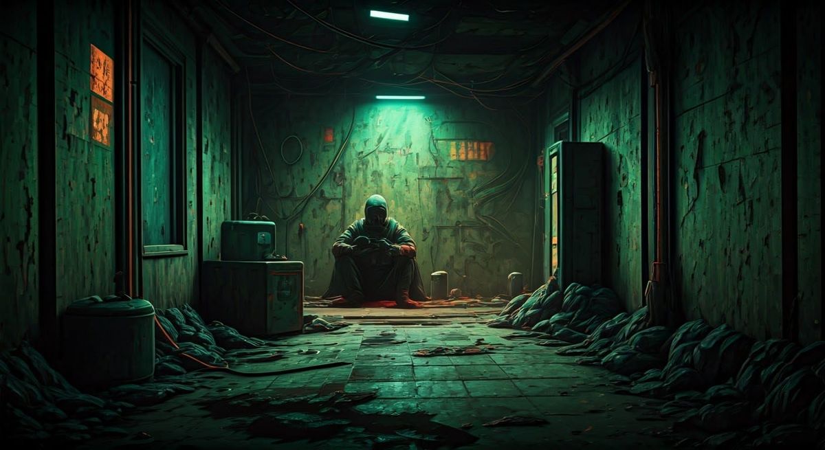 This image shows a solitary figure in a squalid room within a dystopian city. The scene features garbage-textured walls and swirling, brightly colored toxic gases, rendered in a bleak, industrial style.
