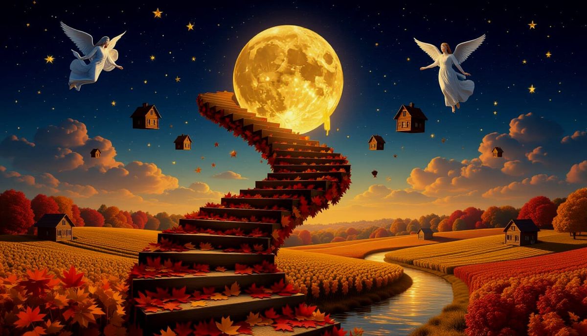 This 3D surreal artwork depicts an autumn night with a staircase of leaves reaching towards a melting harvest moon. Features include glowing fields, cabins in the sky, and angelic trees in vibrant colors.