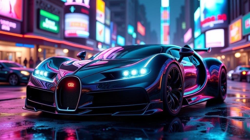 This hyper-realistic image shows a sleek, futuristic Bugatti Veyron in an iridescent obsidian finish, driving through a neon-lit city at dusk. Reflective holographic billboards shimmer on its polished body in a vibrant, cinematic style.