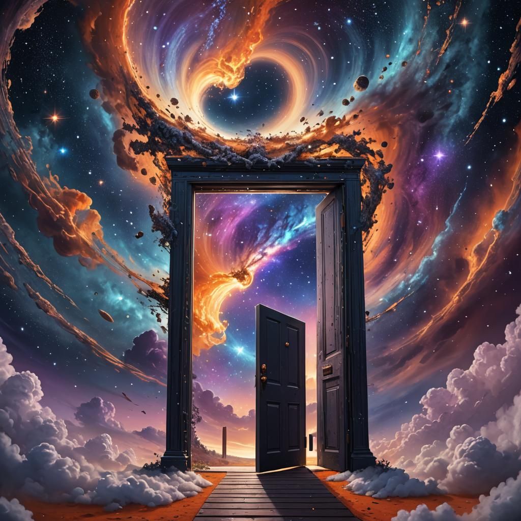 A vibrant science fiction illustration of a doorway in the sky. The path to the door is made of swirling galaxies with stars bursting from the edges in a dreamlike style.