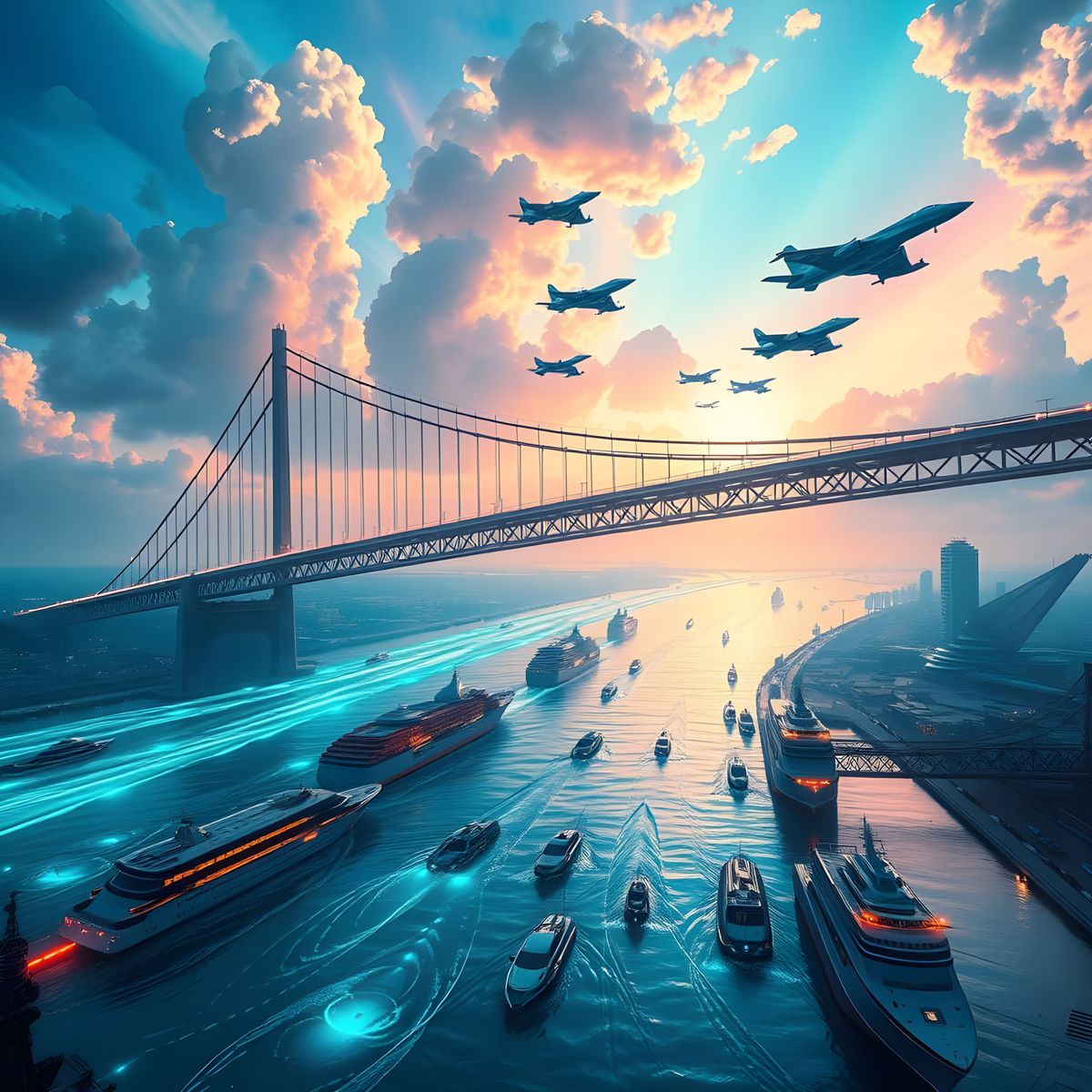 This image shows a futuristic cityscape with a sleek suspension bridge and a vibrant, glowing river. The scene is filled with advanced ships and aircraft, set against a dynamic, high-contrast sky with cumulus clouds.