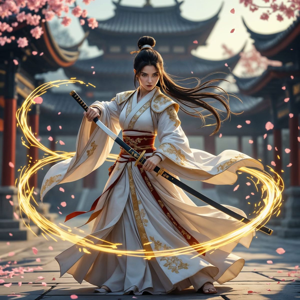 This image shows a powerful martial arts heroine in elegant Chinese robes, wielding a glowing sword amidst swirling golden energy and cherry blossoms. The scene is set against an ancient temple in dramatic, cinematic lighting.