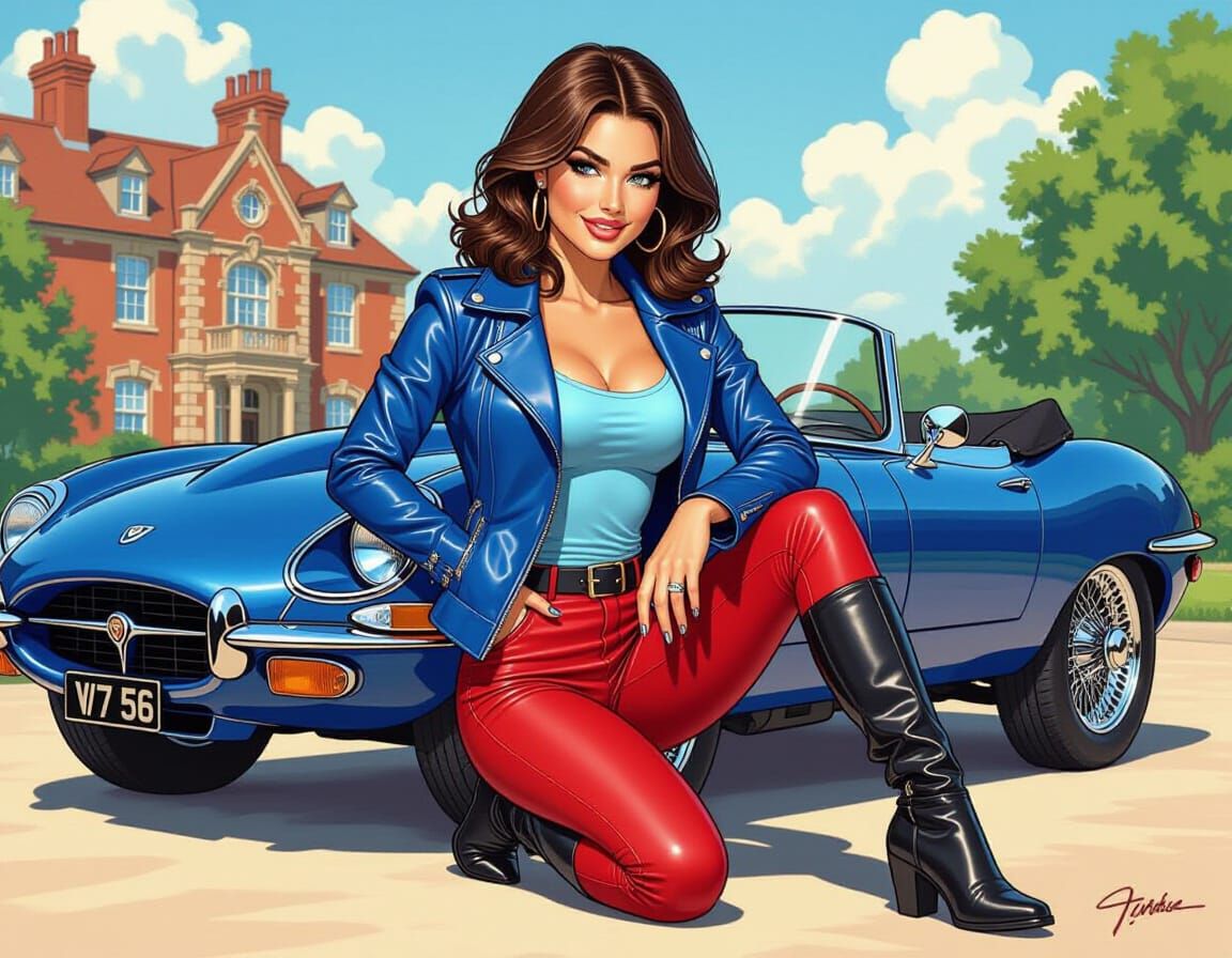 This image shows a beautiful brunette fitness model in vibrant attire, leaning against a classic Jaguar. The artwork is rendered in a dynamic, hand-drawn comic book style with vivid colors and bold lines.