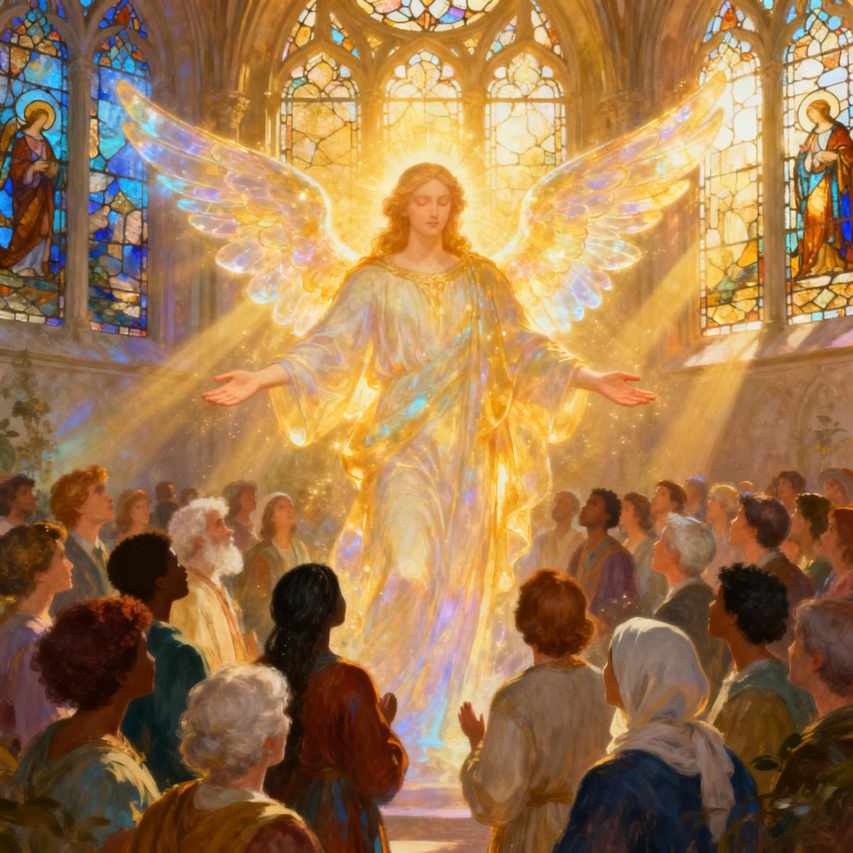 This image depicts an ethereal divine being showering blessings upon a diverse group of people. The scene is rendered with luminous, glowing qualities, reminiscent of Renaissance art and contemporary digital painting.