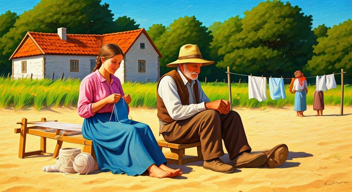 This idyllic image captures a peaceful moment of rural life, where a woman and an older man sit on a sandy beach, surrounded by lush greenery and a rustic house. The atmosphere is tranquil, with a bright blue sky and warm, golden light, evoking a sense of nostalgia and simplicity.