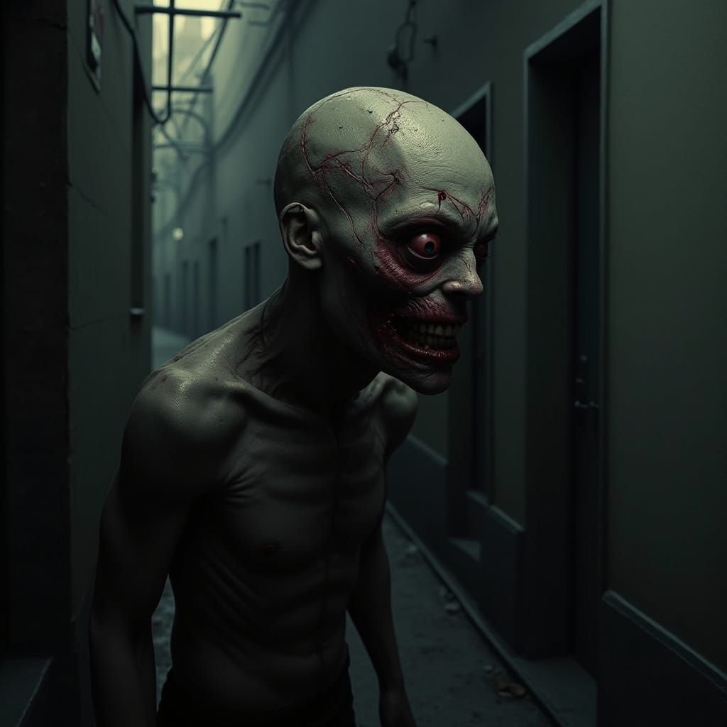 A haunting image of a figure with a mass of rotting skin, surrounded by shadows and whispers, with a single bloodshot eye weeping crimson tears in a dark, damp alleyway, reminiscent of a hyper-realistic, crime scene photograph.