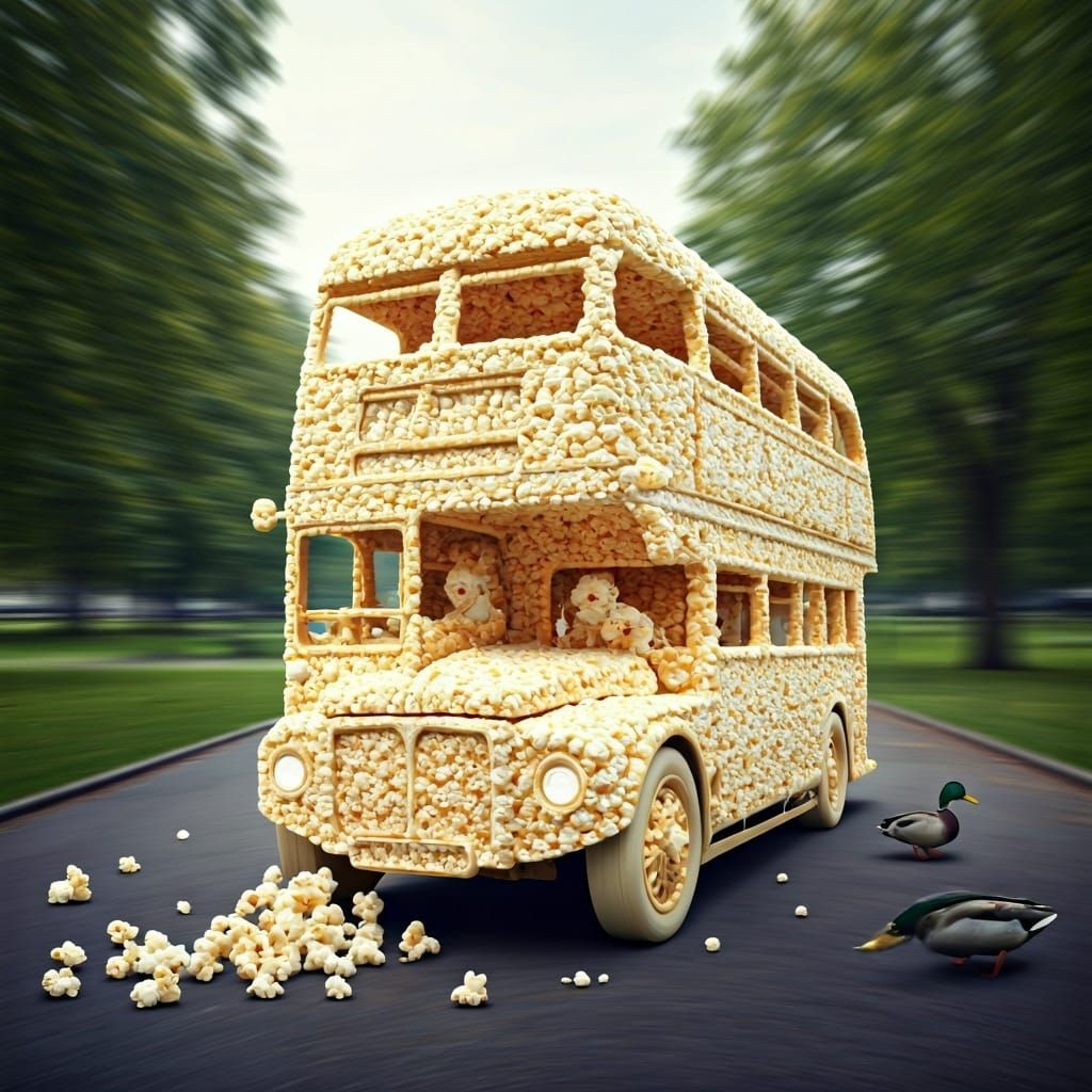 This image shows a fantastical popcorn bus driving through Hyde Park, leaving a trail of popcorn. Ducks follow behind, eating the spilled popcorn, in a cinematic, photorealistic style.