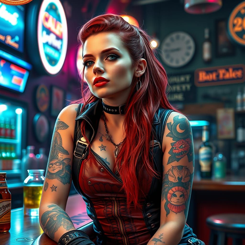 This image depicts a red-headed, tattooed biker in a sci-fi setting. The rebel woman is in a crowded bar, seemingly searching for a partner, rendered as digital art.