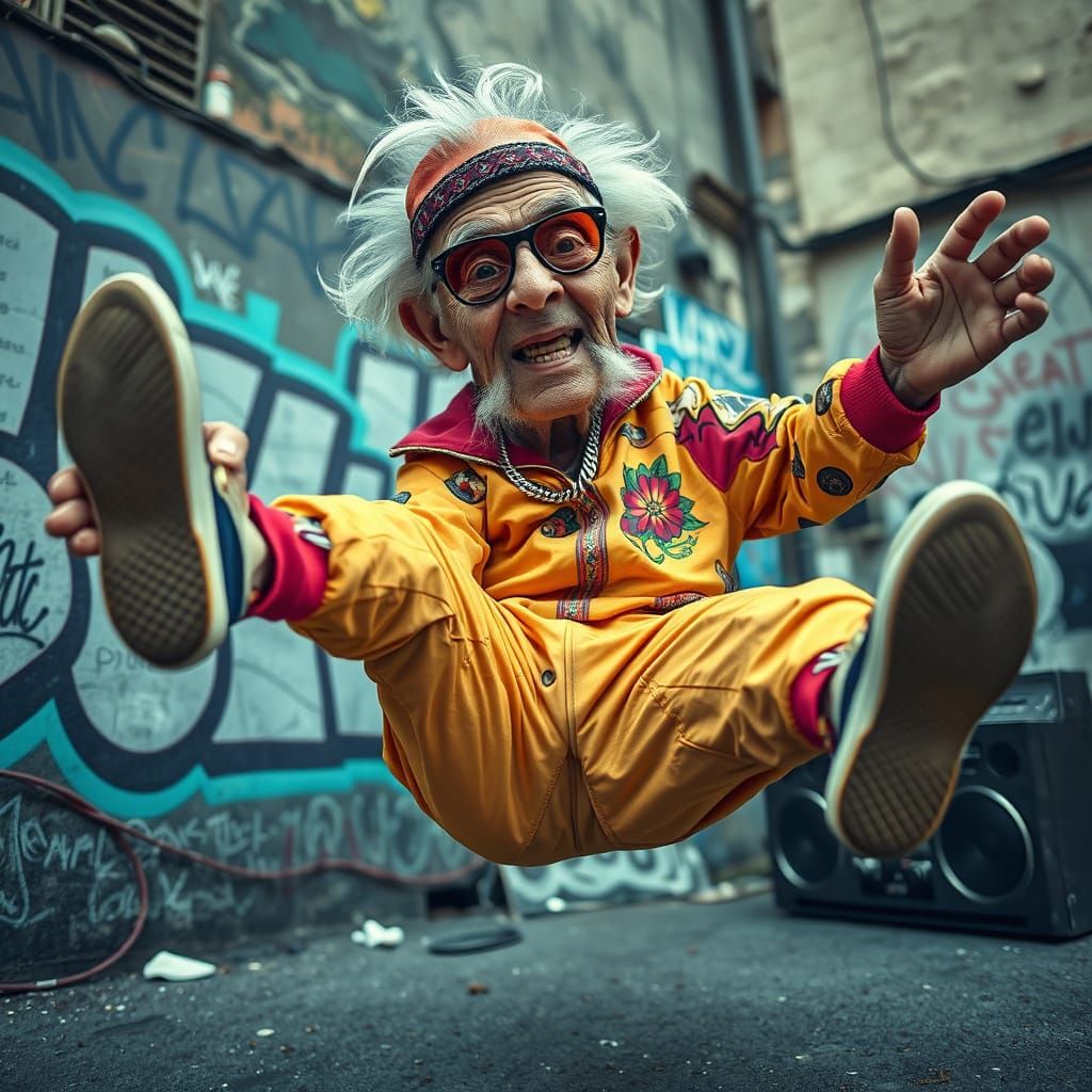 This image shows an elderly woman in streetwear breakdancing in an urban environment. The hyperdetailed, photorealistic style, reminiscent of Stalenhag and Mead, captures intricate textures and high-speed action.