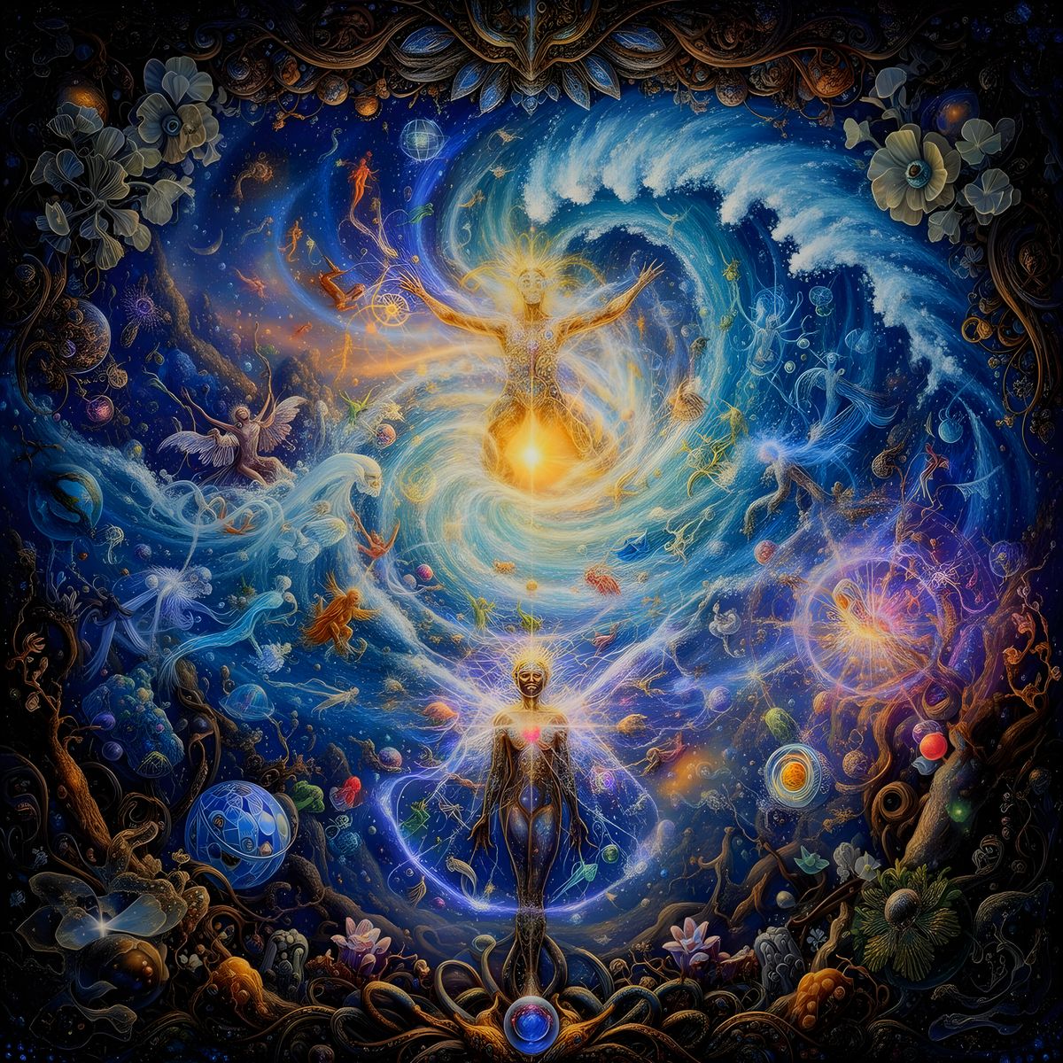 This image depicts majestic, bubbling waters representing the sea of souls and infinite futures. It captures a vibrant, expansive, and joyful representation of consciousness and potential.