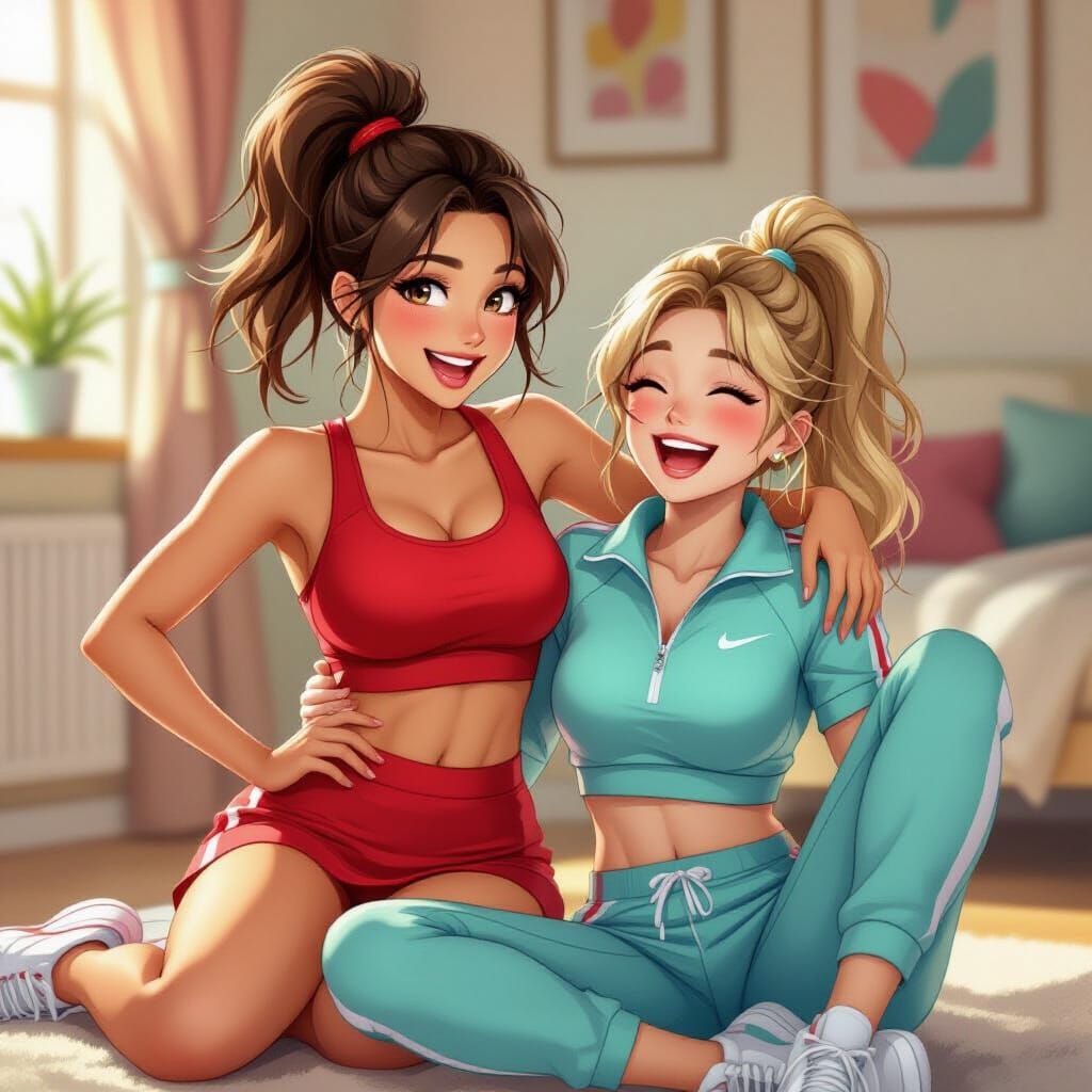 This image shows two joyful friends laughing and teasing each other, dressed in colorful sporty outfits. Created in a detailed 3D anime art style, it captures a moment of playful friendship and energetic fun.