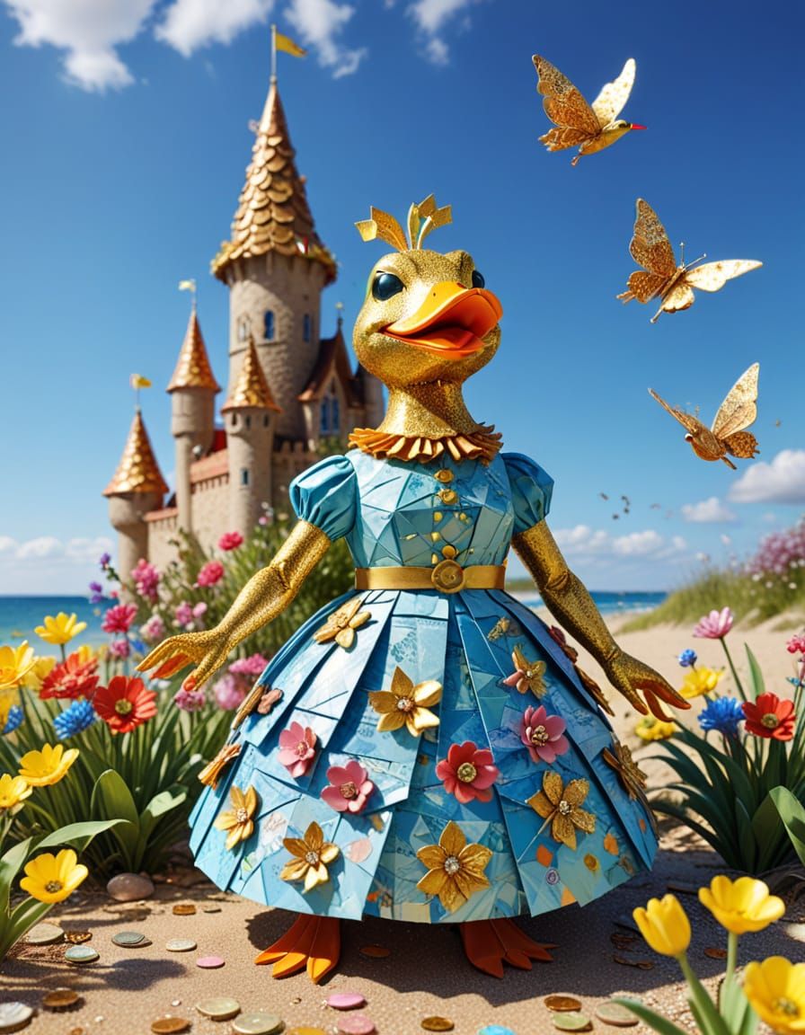 This image showcases an origami frog made from dollar bills, set in a bright, sunny meadow with butterflies and blue sky. Features vibrant colors and a cheerful atmosphere.