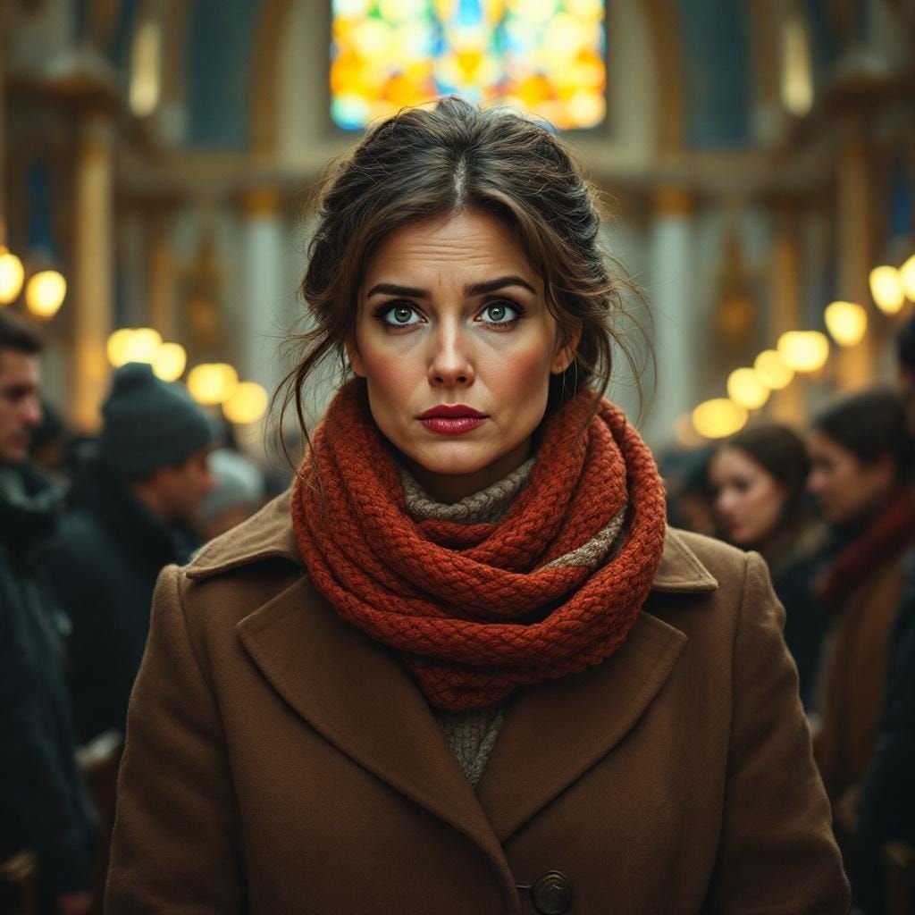 This image shows a judgmental woman in a church, disapproving of a couple seeking help. The portrait, reminiscent of Gouache and Watercolor art, features thick brush strokes and impasto texture, with a colorful background.