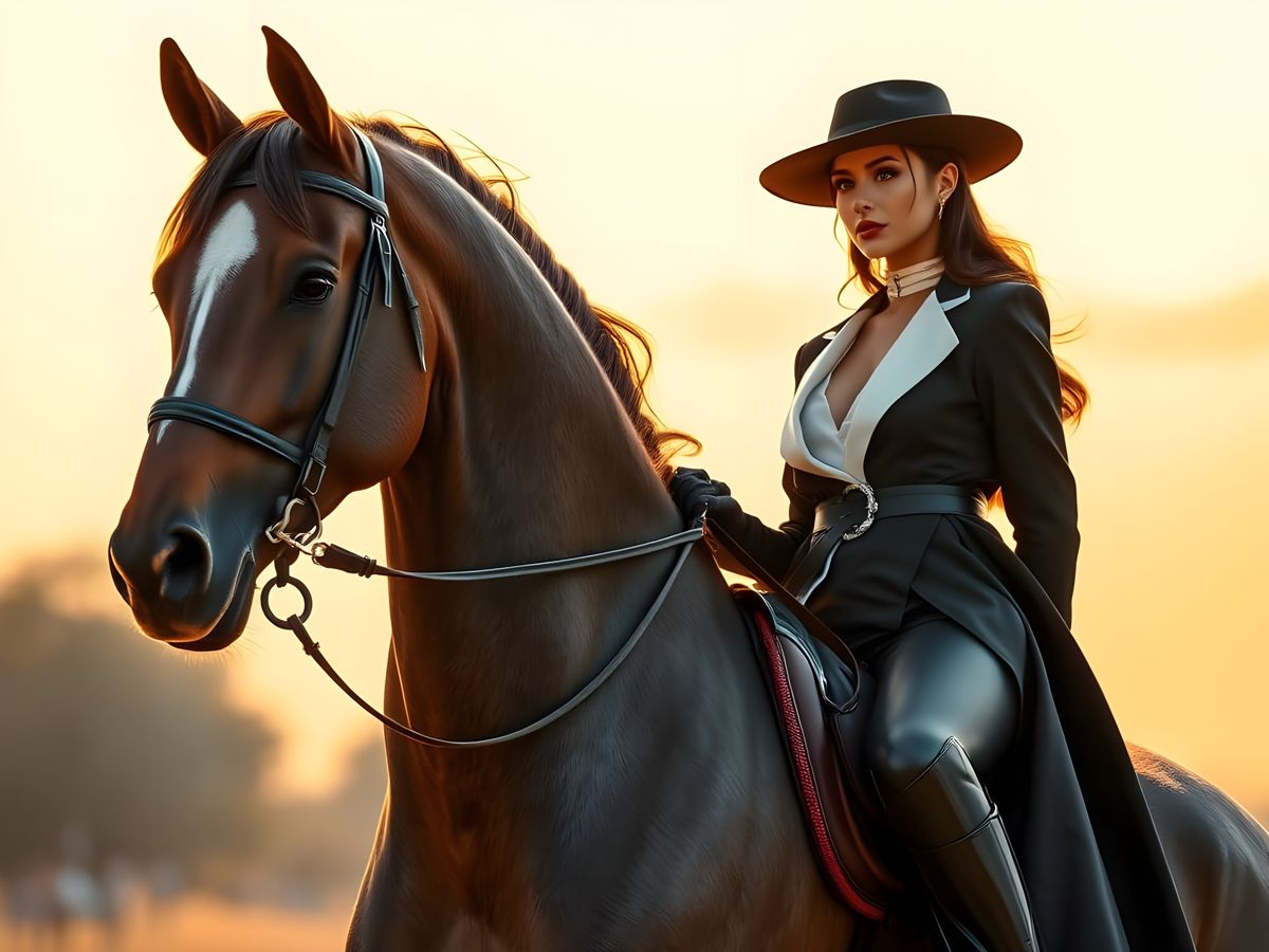 This image showcases a modern woman riding a horse with confidence and poise, captured in a hyperrealistic style with intricate details and vibrant colors.
