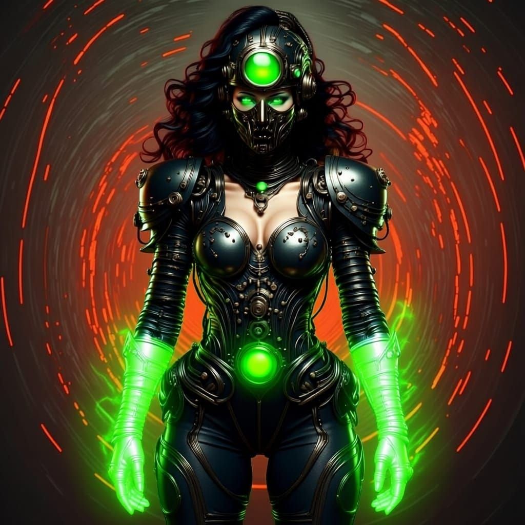 This hyperrealistic image shows a curvy 1950s female superhero with glowing green eyes and metal armor plating. She poses dramatically, showcasing intricate detail and vibrant colors.