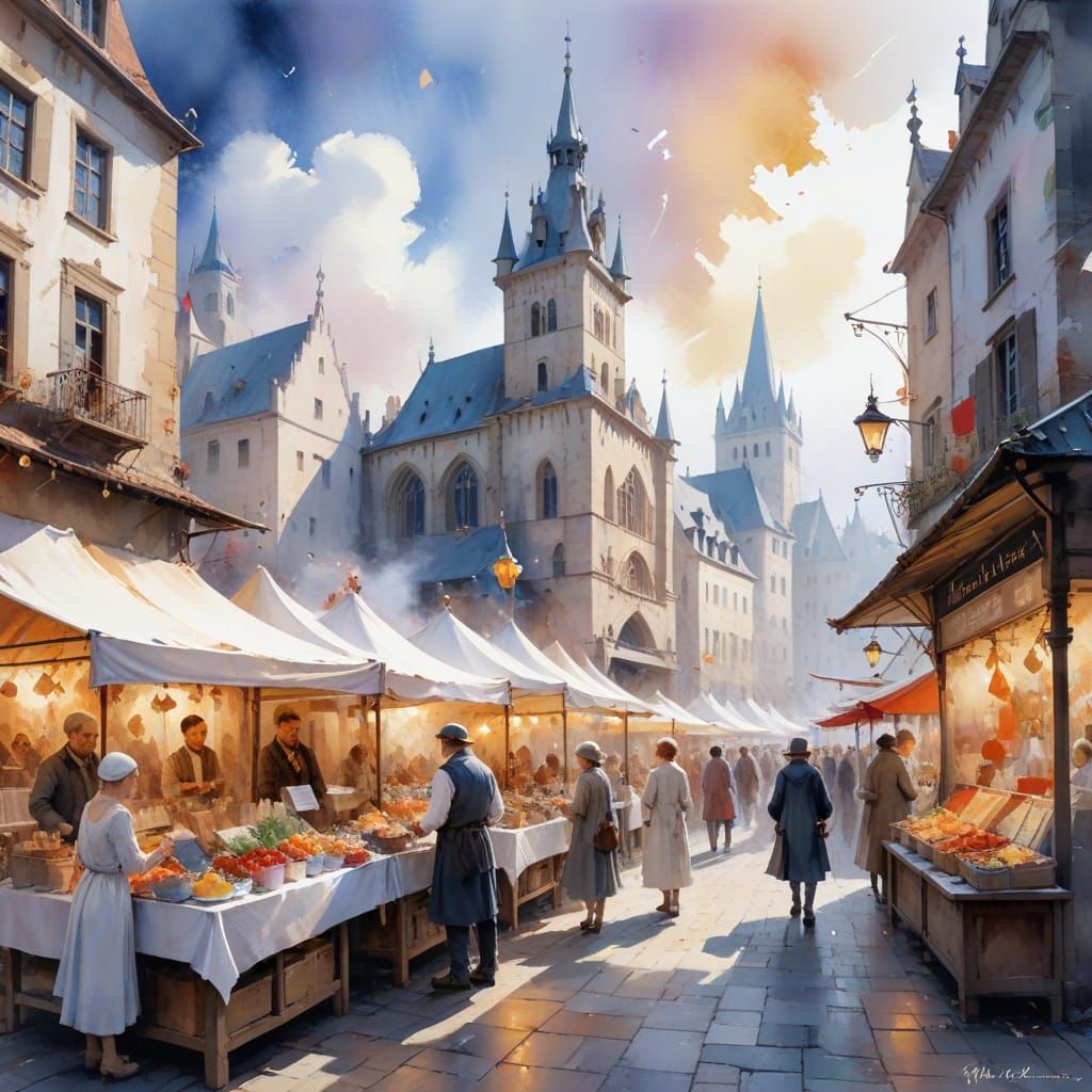 A vibrant fantasy market scene filled with vendors and creatures. The image blends watercolour techniques with cinematic stylization, creating a beautiful and chaotic composition.