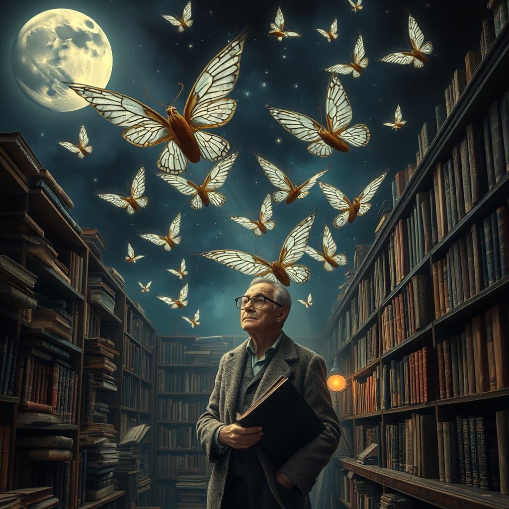 This enchanting scene depicts a mystical bookstore where books transform into winged creatures, generating a whirlpool of literary magic under the soft, lunar light. Inspired by surrealist masterworks, the dreamlike scene blends unexpected juxtapositions and eerie beauty.